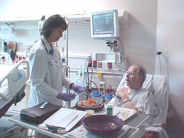 From left to right: 1. Danny took a picture of Gary who works at the office desk most of the time that I have been there, but helps out when needed for patents, and today with a little help from Danny they almost got to preaching which as Martha Stewart says "IS A GOOD THING" . 2 & 3 Danny just after getting the trachea out. 4. The Speech Therapist gave Danny oatmeal with honey and some other things for breakfast. Then brought him some broiled chicken, carrots and pudding for his lunch to. He ate part of it and I finished the rest. They will hook the feeder back to him for the evening feeding. 5. Was as I was getting ready to come home.