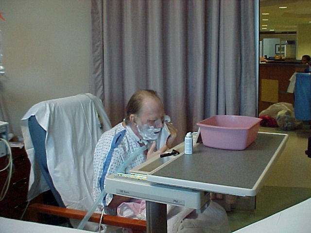 All things considered Danny is doing GREAT BUT! by no means is perfectly OK! He has his good moments and bad, this with the shaving is one of his better ones. As I tried to explain to his brother in a note last night when he mentioned he may be coming down to see him. Different things that he does & some more below that I didn't tell him about.