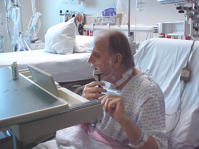 Hi ALL, They took out the drainage tubes today BUT!! had no written permission to take out the stitches as the Dr's said the other day (someone dropped the ball on the permission). Danny was doing good all day and this morning wouldn't even let us help him shave he left it a bit choppy "BUT NOT BAD FOR THE FIRST TIME TRY".
