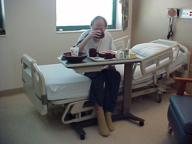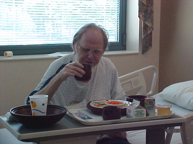 Danny id still on the feeding tube in his stomach to get extra things that he need to build is strength up PLUS "We" had a good dinner from the kitchen like yesterday. He had roast beef, mashed potatoes, green beans, roll, apple juice & cake, and he did a good job of eating.