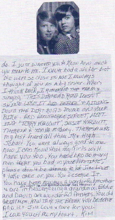 This is a letter received by Sandra (Husk) Shelly from her cousin Kim, the photo is them as children they were quite close growing up.