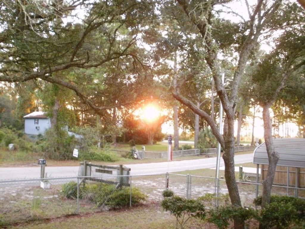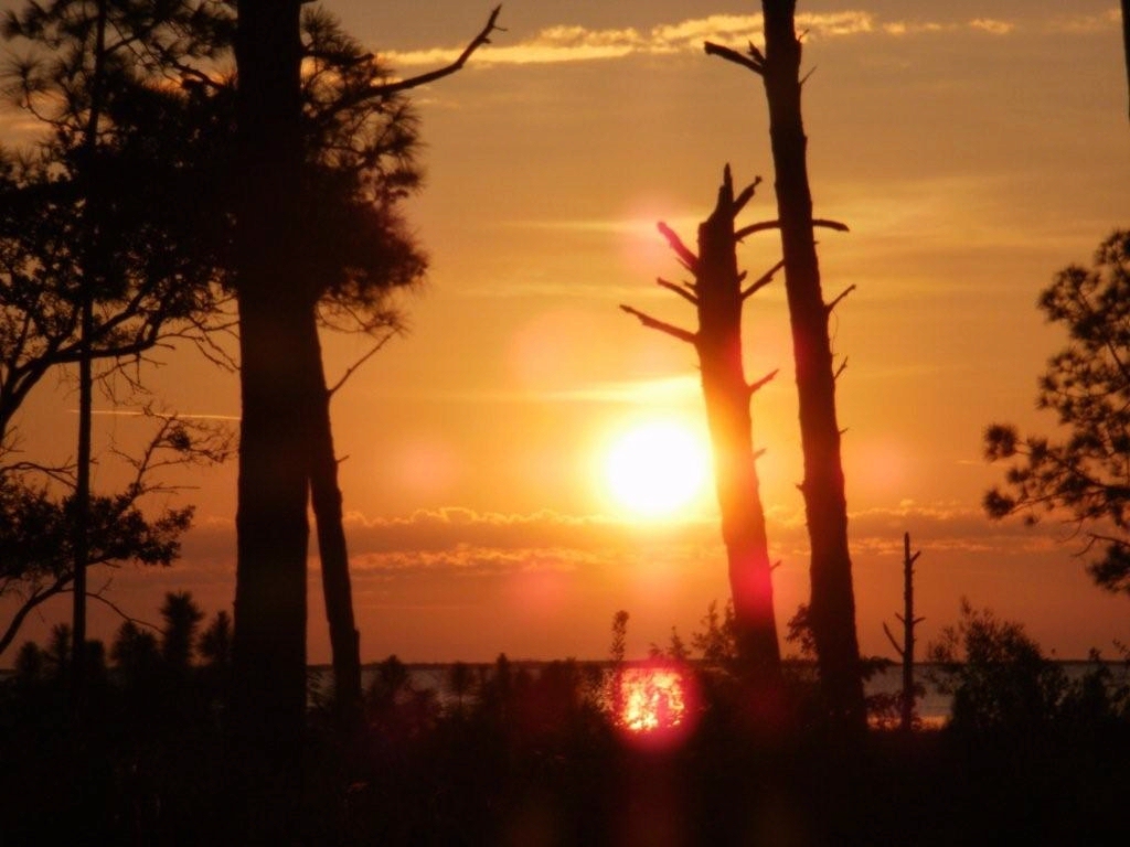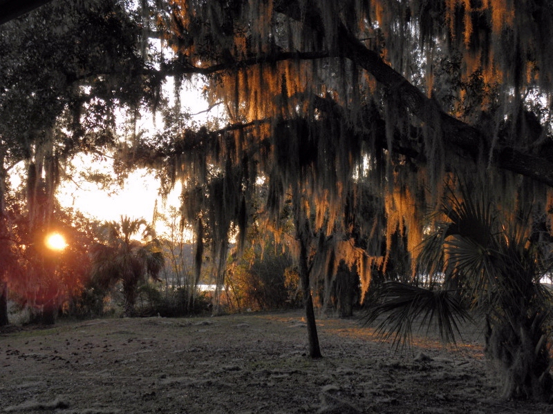 The day started a bit better here on the Gulf at St. George Sound with a blinding sunrise across the Bay. As Danny left for his work at the prison he called from the car to ask me to get a picture of it. As if I didn't have enough already after 16 years of living here. So I took one from the front porch then walked over to the other side of the road to get one with two dead trees in it. The glare was so bright off the water it looked like the bushes were on fire.