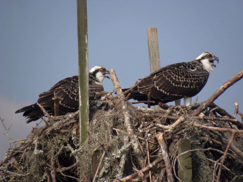 Notice that Hilda's eyes are green while Cooter's and Henrietta's are red.....a characteristic of all adolescent Ospreys!!